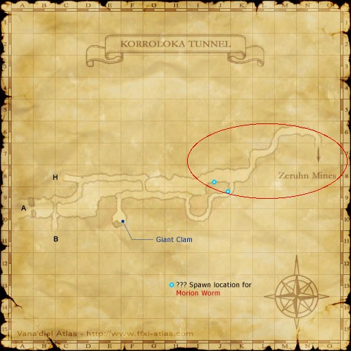 When hunting this spell there are so many low level Tri-Bats to choose from that picking a best camp is difficult. Korroloka Tunnel works well because in the area marked above there are close to a half dozen Tri-Bat spawns with no aggro near them. Buff up, Grab a Tri-Bat, Bludgeon it a few times to feed it TP and cut it's life down, then use a low damage weapon to feed TP. A level 28 Blue Mage will have no problems here.